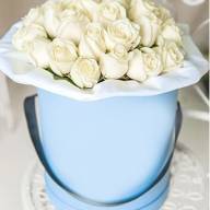 Белые цветы издавна обозначают доброе отношение, светлые чувства, нежность, чистоту и гармонию. А розы этого цвета – лучшие цветы, подходящие ребенку в честь Дня Рождения, возлюбленной на свидание или годовщину и невесте на свадьбу. Цветочная композиция в стильной голубой коробке смотрится органично, а добавление зелени обеспечивает естественность и натуральность. Запах роз улучшает настроение дарит позитив, оставляя навсегда отпечаток в памяти.